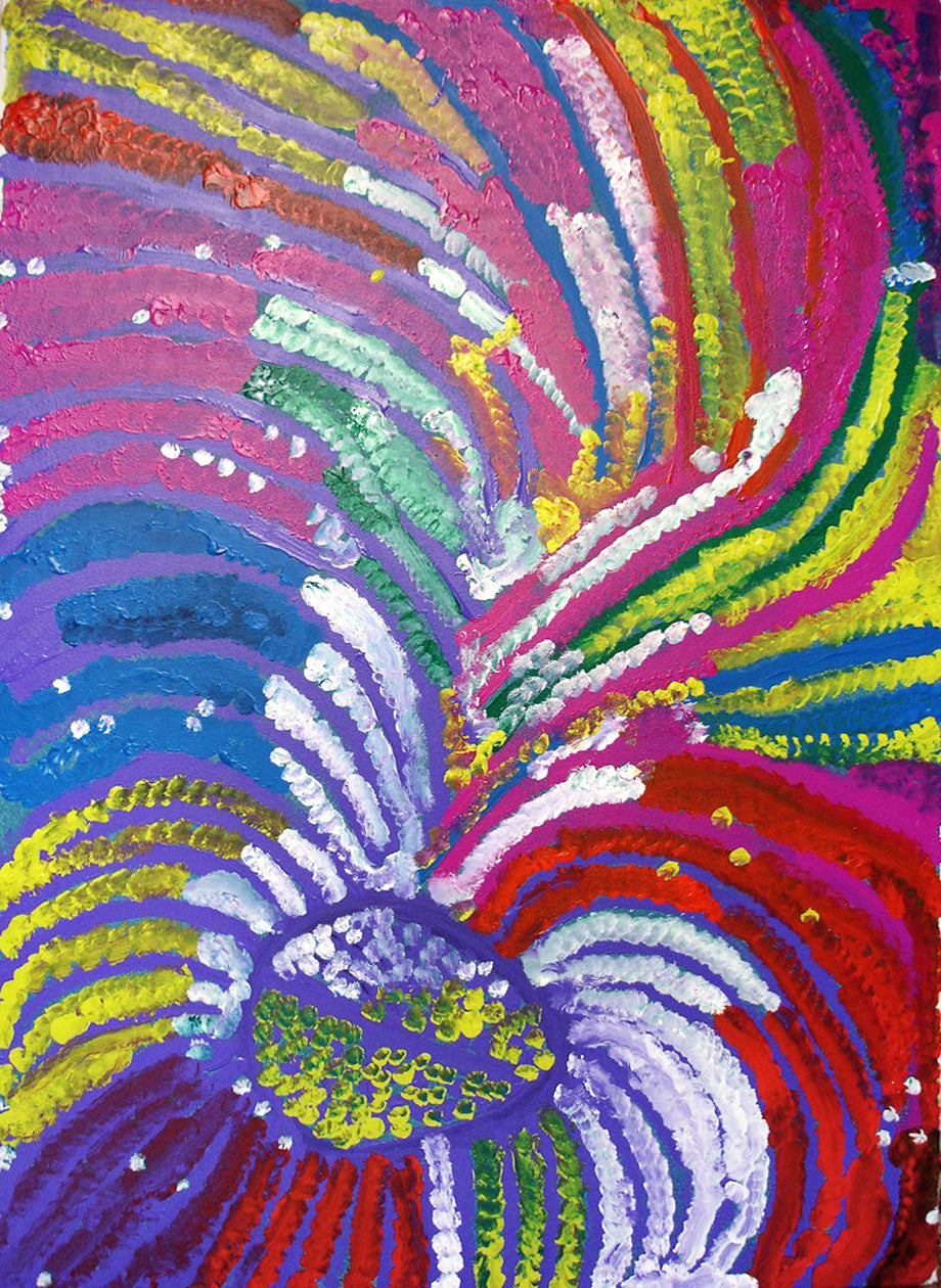 Acknowledged as one of the great innovators of the Warlpiri art movement from Lajamanu, Lorna Napurrula Fencer was both a fierce and gentle custodian of her culture. She painted the great Napurrula-Nakamarra creation stories from her brother’s custodial site at Yurmurrpa. These ceremonial stories re-enact the myths of the Ancestors who dug out the first yarla, or bush potato, from the earth around the underground water source at Yurmurrpa.