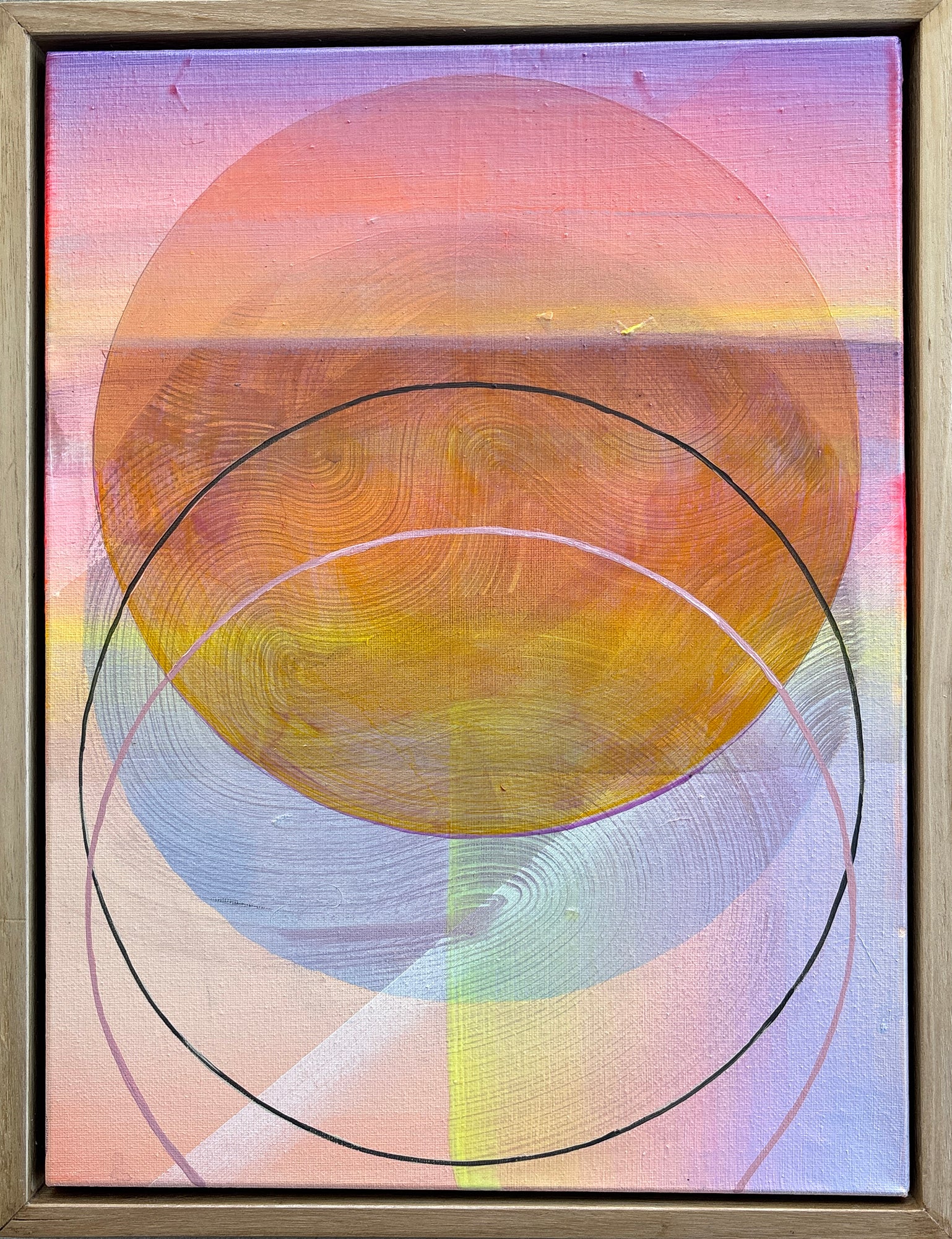 The ‘Many Moons Nights’ series uses lunar shapes, repetition and colour gradients in evoking the passage of time. Connecting with natural rhythms such as paying attention to the moon cycle has become part of my daily activities and influenced this calendar-like grid collection. Each piece acts as a little meditation of sorts, with central shapes woven into grounds with horizon lines. The colour scheme draws from luminous skies at dawn and nightfall. Perhaps these paintings may act as a touchstone to honour time in an often speedy world.