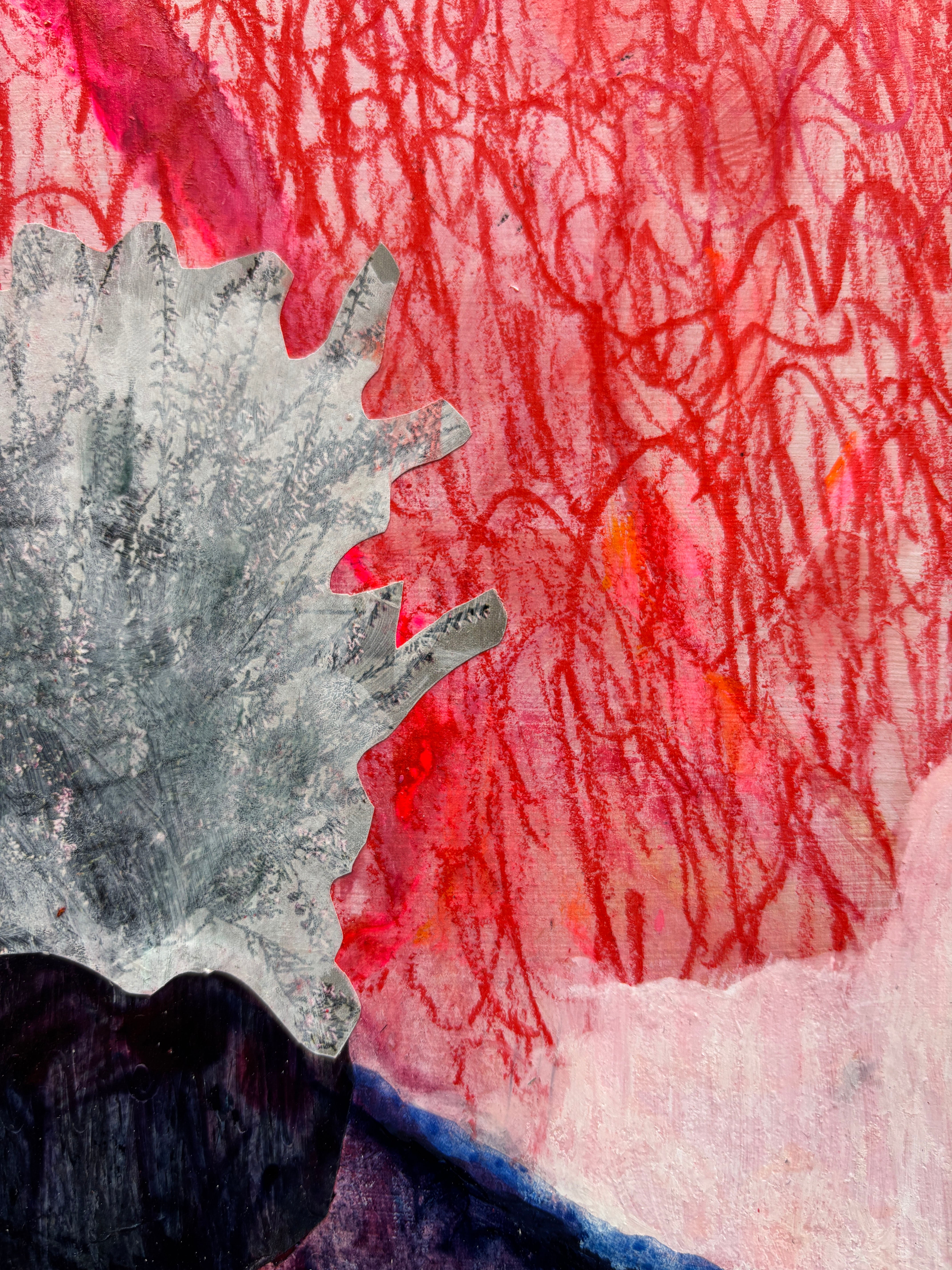 Informed by shapes and motifs of the natural environment and patterns of decay and regrowth, her intimate works draw the viewer into quiet contemplation and an unspoken dialogue with the details of the other-than-human world as well as with our own inward geography. Visual symbols, as well as personal and collective metaphors inform her creative process- juxtaposing her internal world with the exterior landscape.