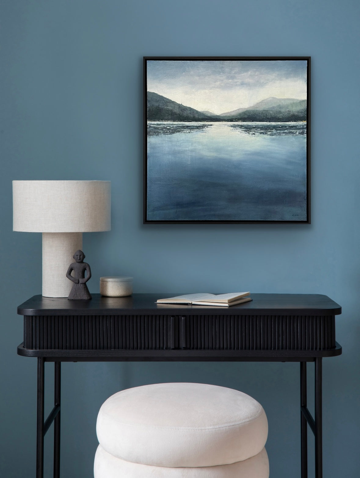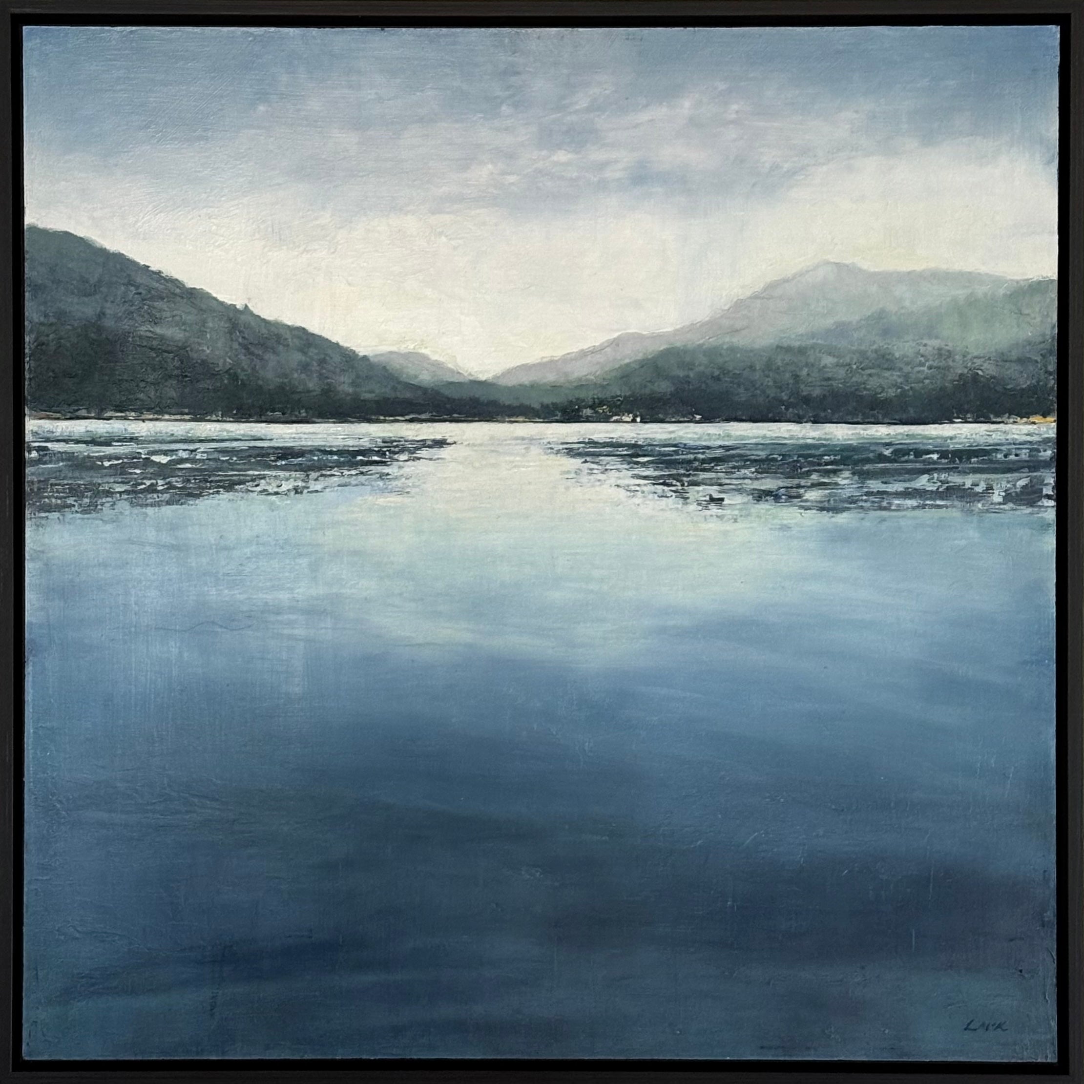 Oil on board, framed in black timber box frame.