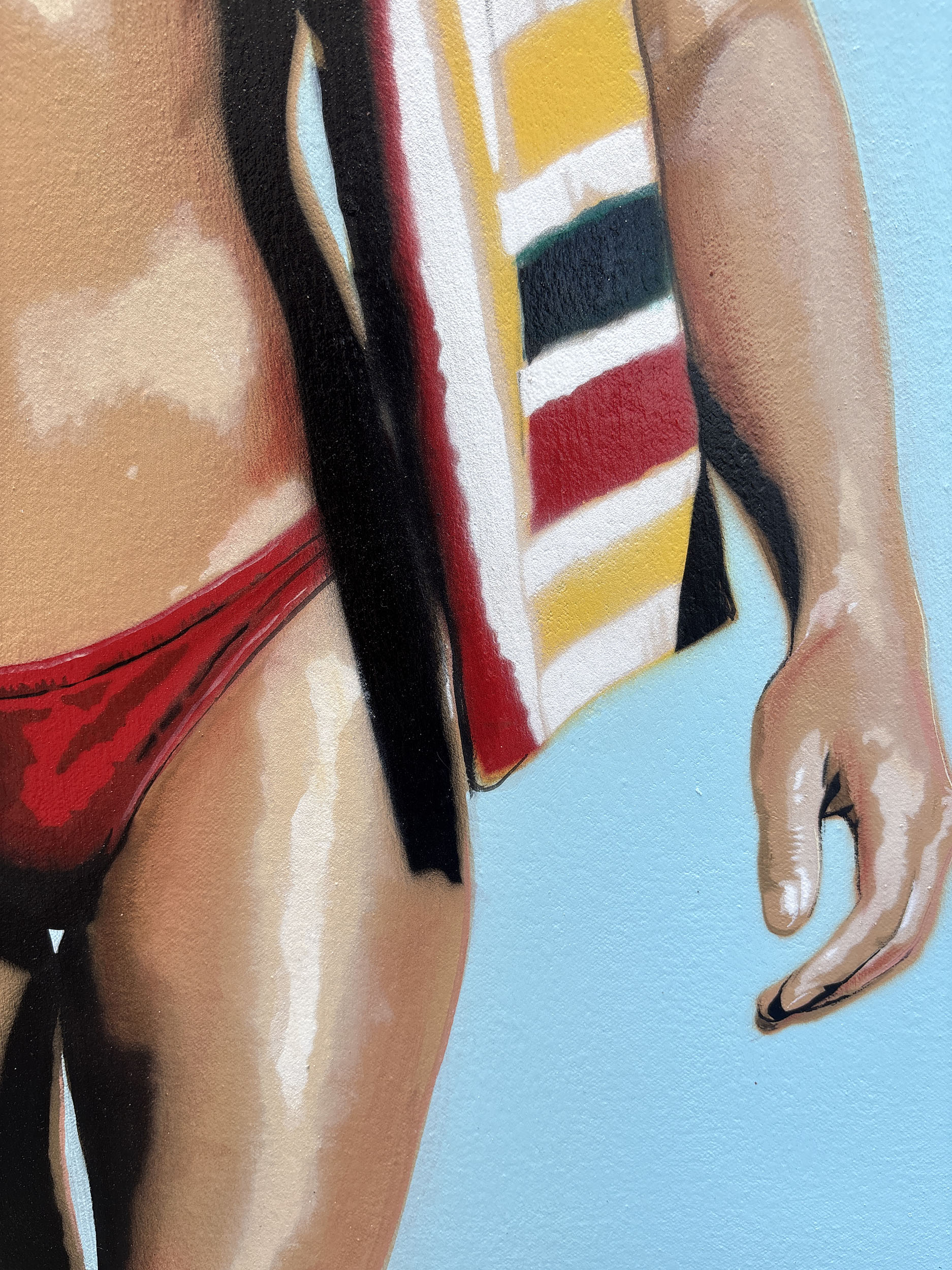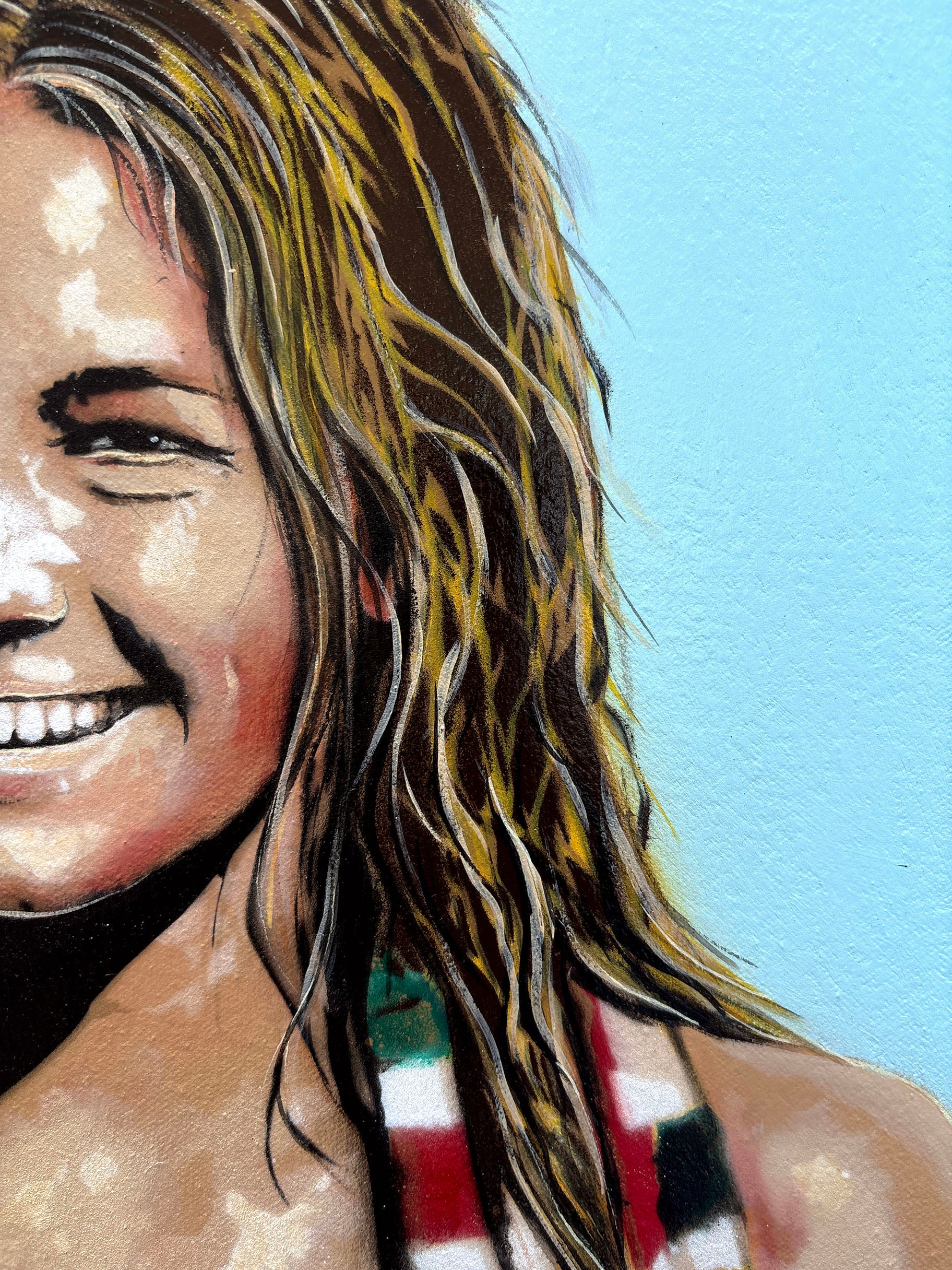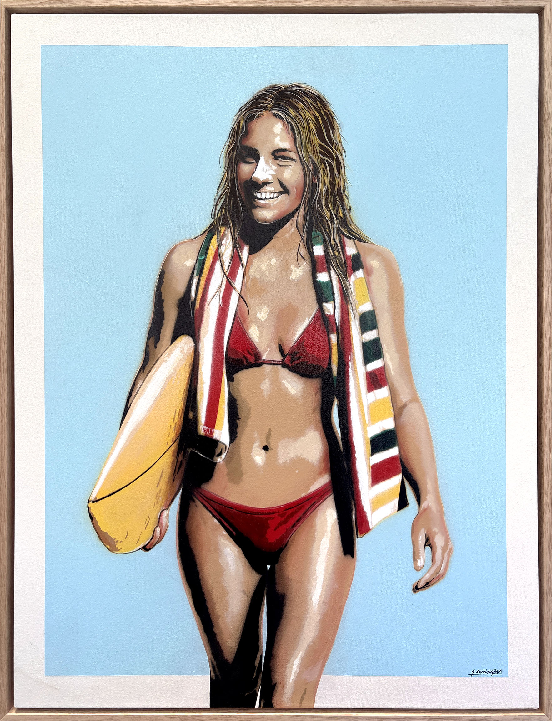 'Sunshine State' captures the essence of an Australian summer — golden light, salty skin, and that carefree grin that only comes after a great surf. Wrapped in stripes and confidence, she's the spirit of those endless beach days: bold, natural, and utterly alive.
