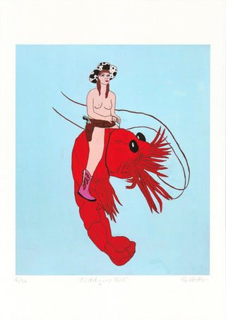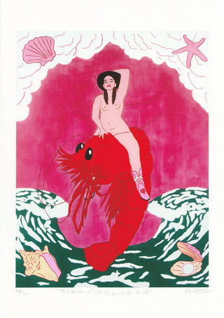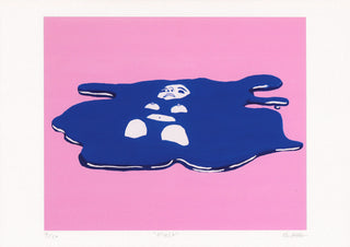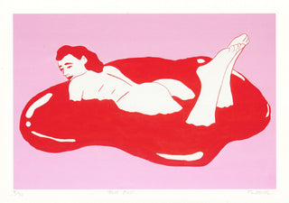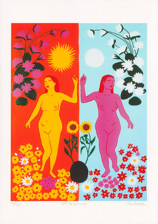 Colour contrasts are a central point in Em’s work, and she paints in a signature flattened style with bold bright colours and a focus on line and form over shading, to achieve this she uses a type of matte paint that achieves a level of hyper pigmentation.