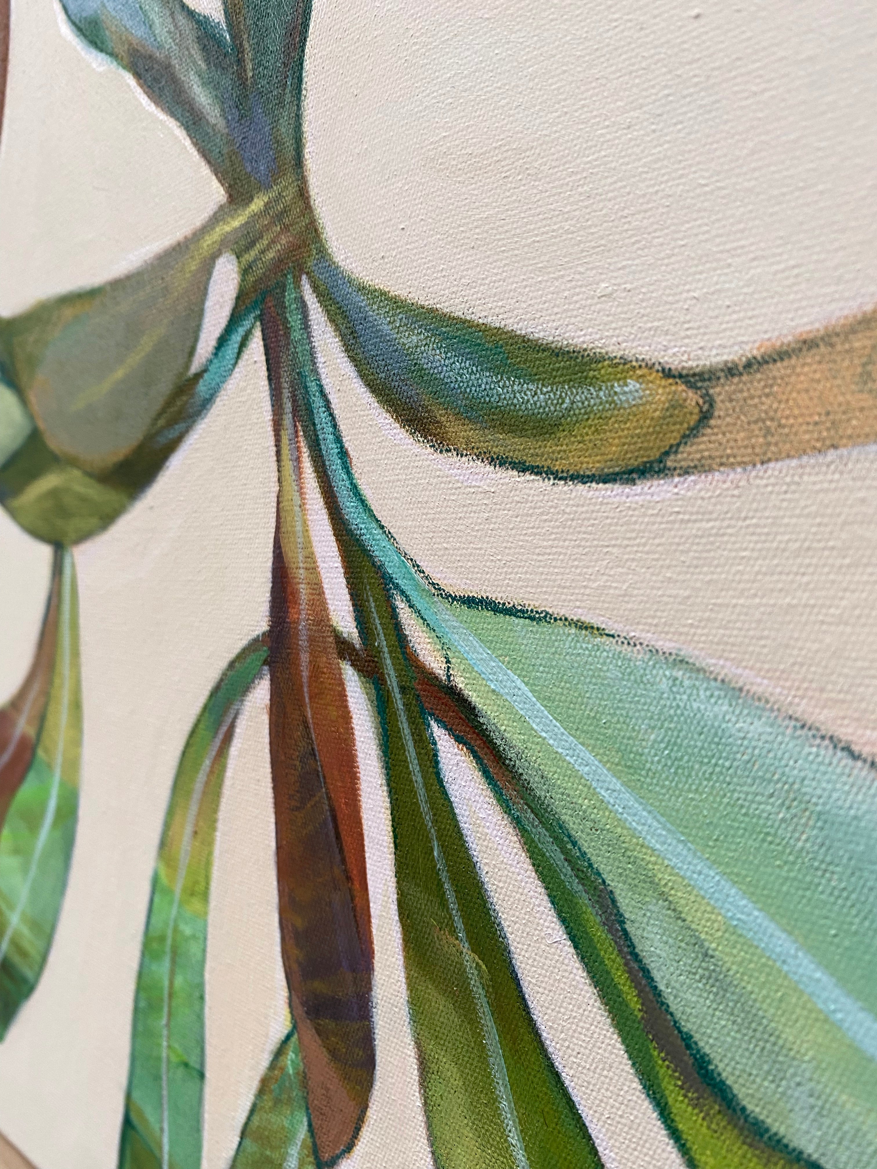 Lisa works primarily in acrylics, with a planned process that is nevertheless flexible to spontaneity. She is inspired by impressionists, and their obsession with colour and light – often finding herself drawn to the emotion a single colour can evoke. Lisa's subject matter is often botanical, though many of her paintings are symbolic: a particular flower representing family members or someone who has passed away, with the story hidden in the image.