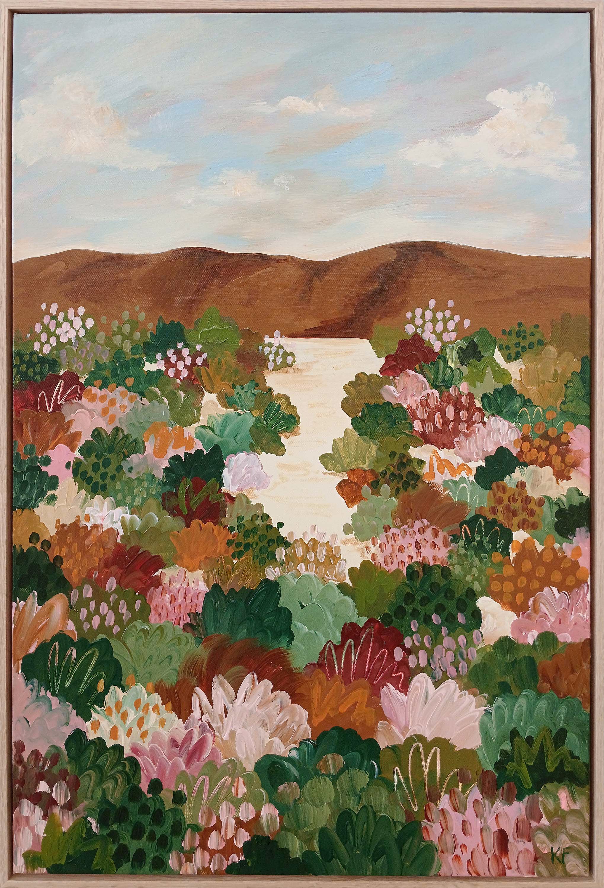 Acrylic on canvas, box framed in natural oak.