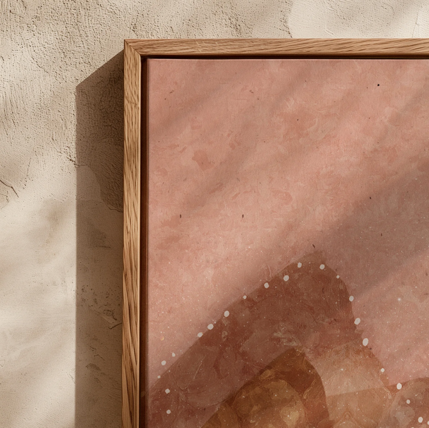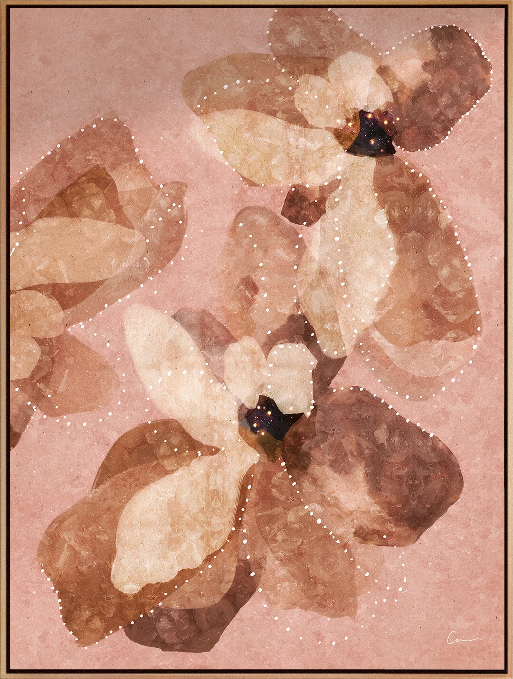 Mixed media of digital, giclee, gold/brass foil and hand-etched texture on canvas, framed in raw oak.