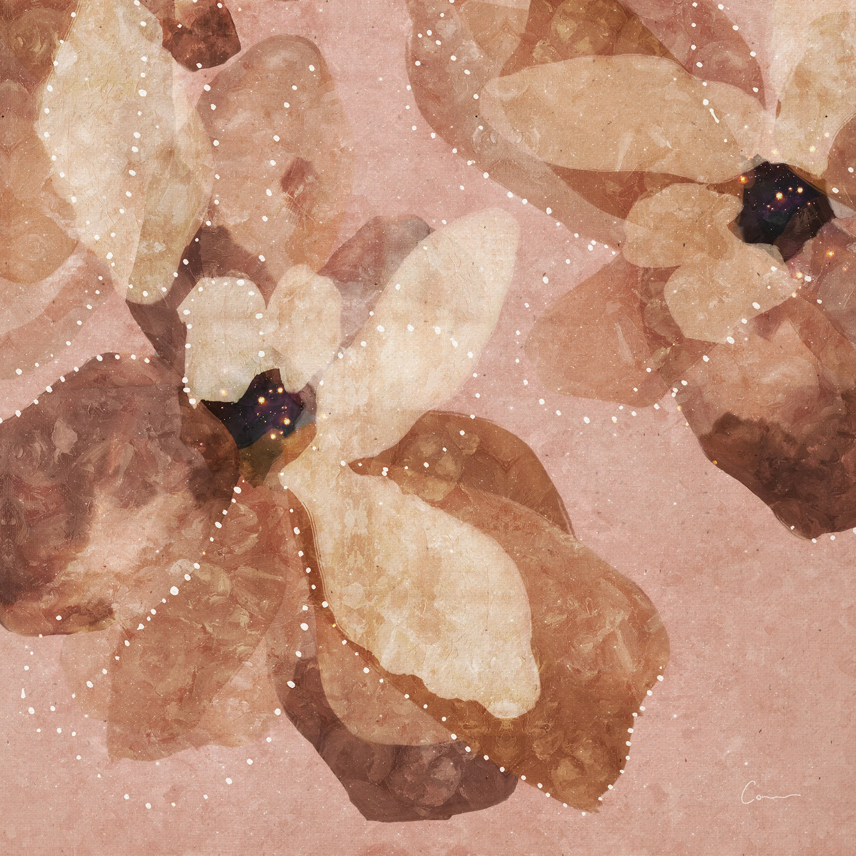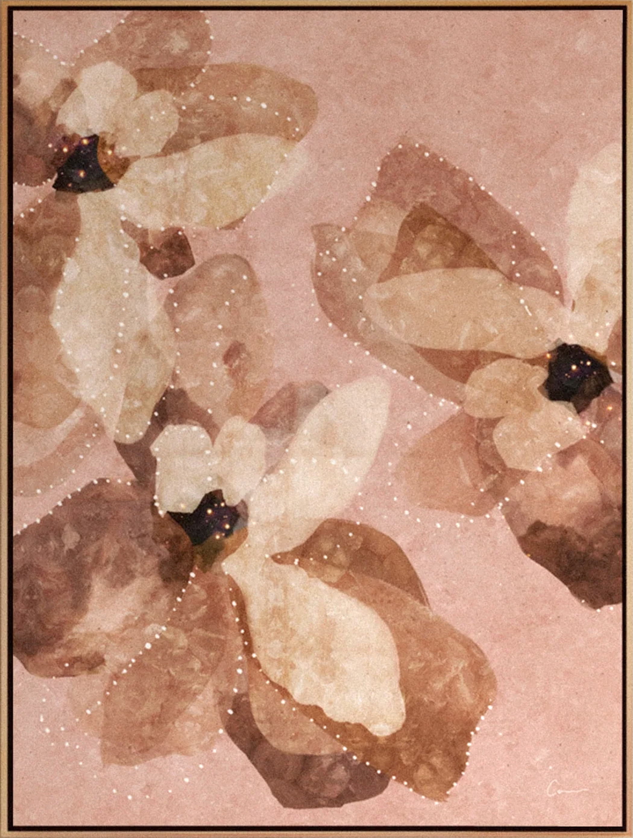 Mixed media of digital, giclee, gold/brass foil and hand-etched texture on canvas, framed in raw oak.
