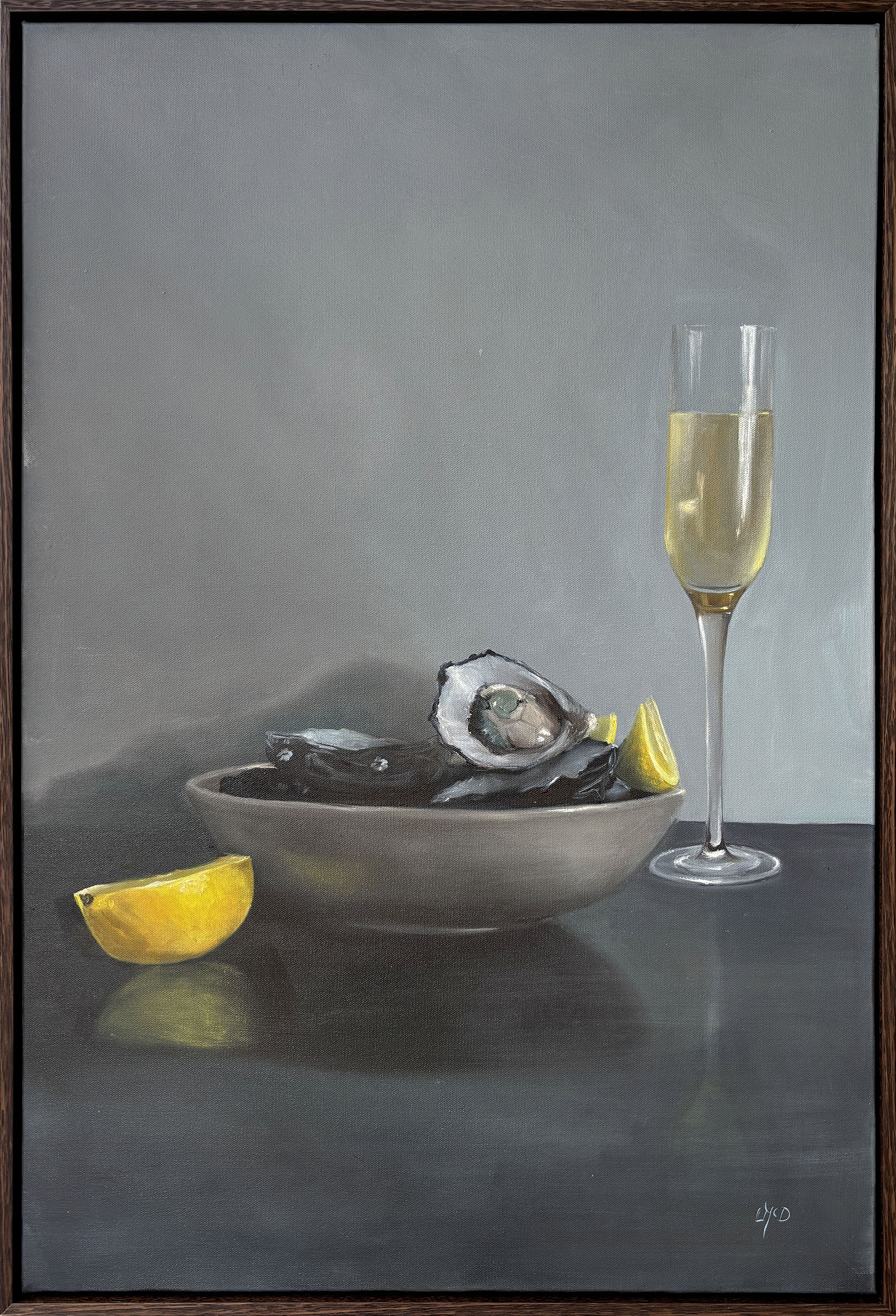 Oil on canvas, box framed in black stained timber.