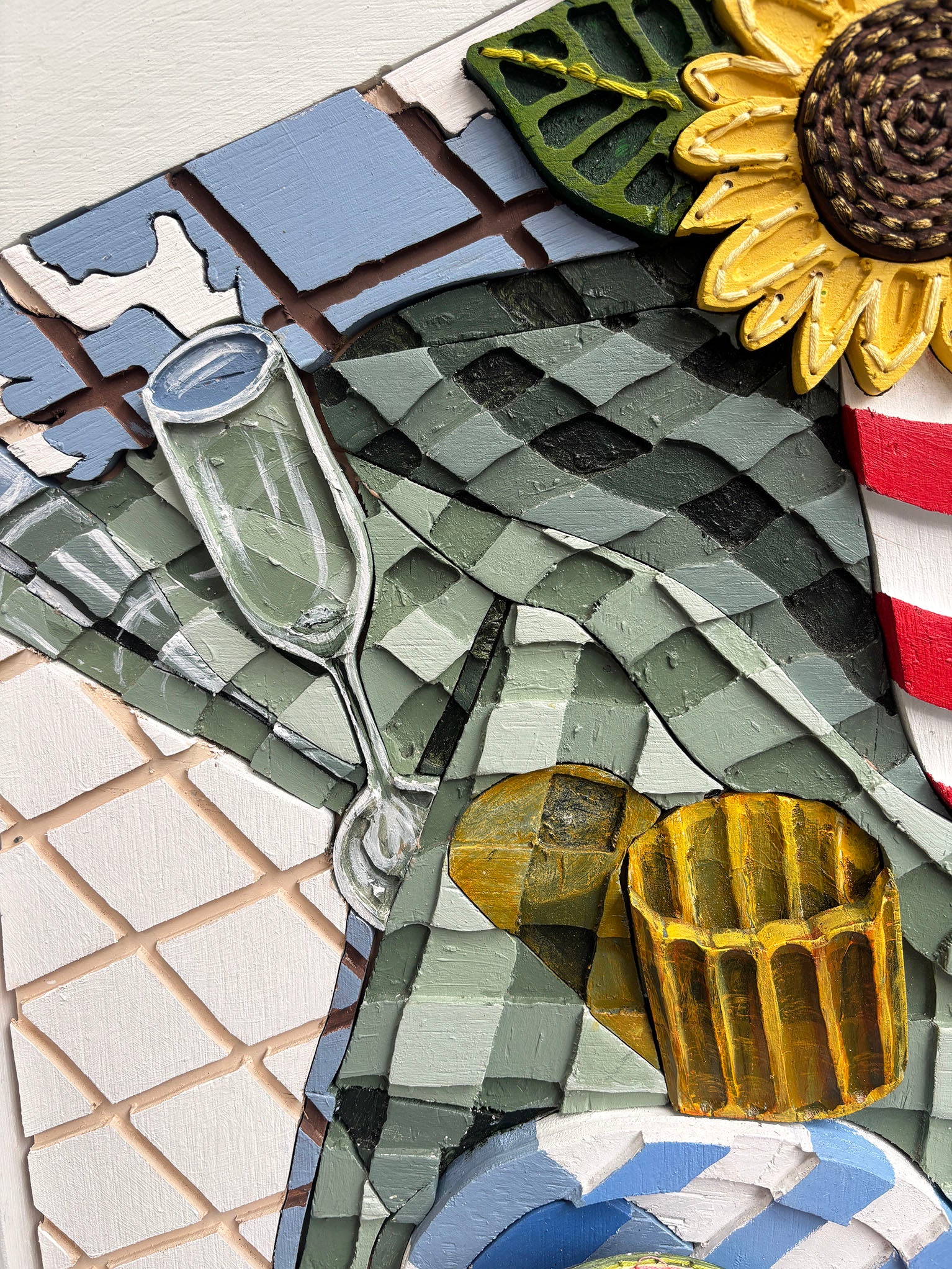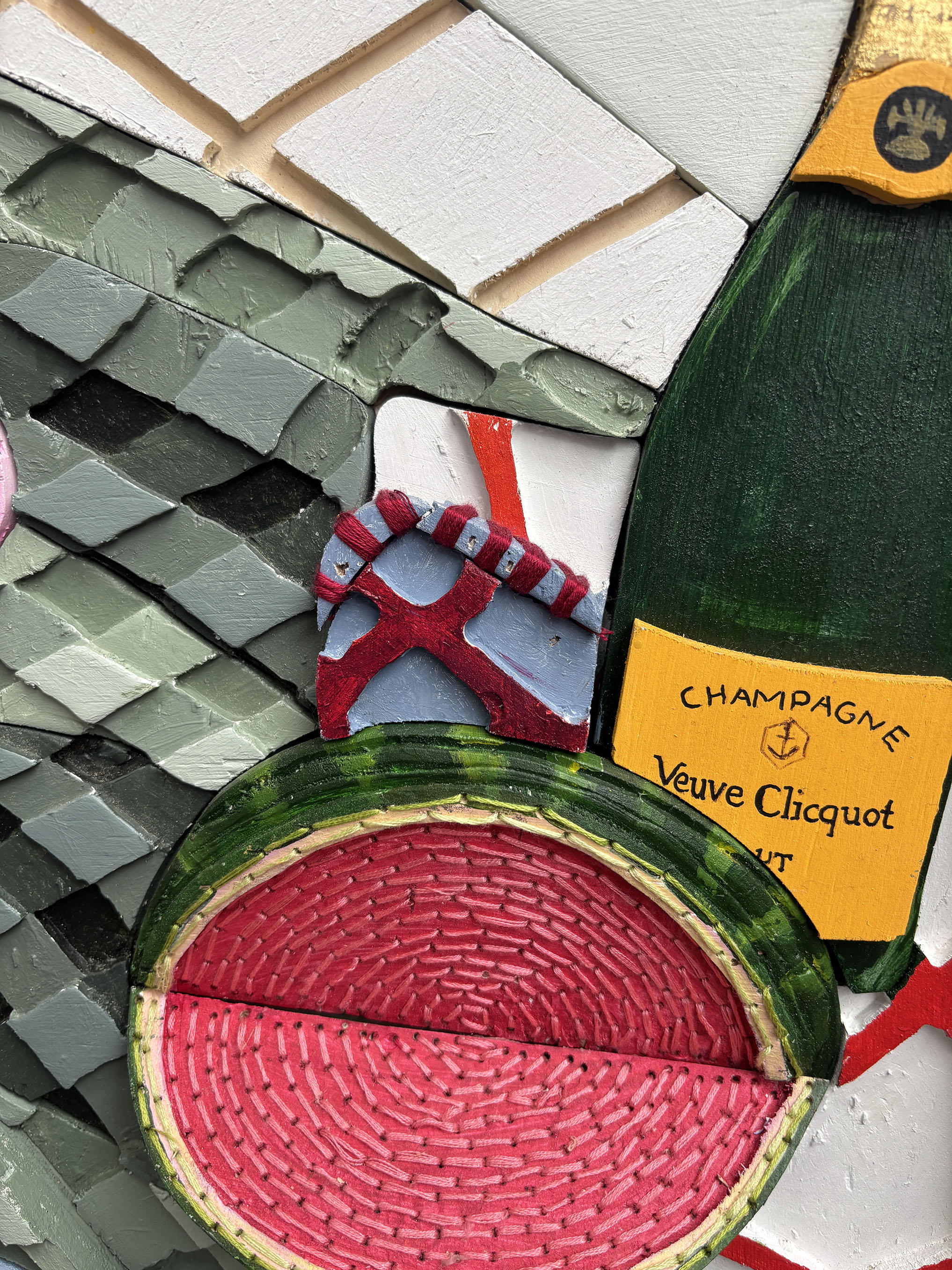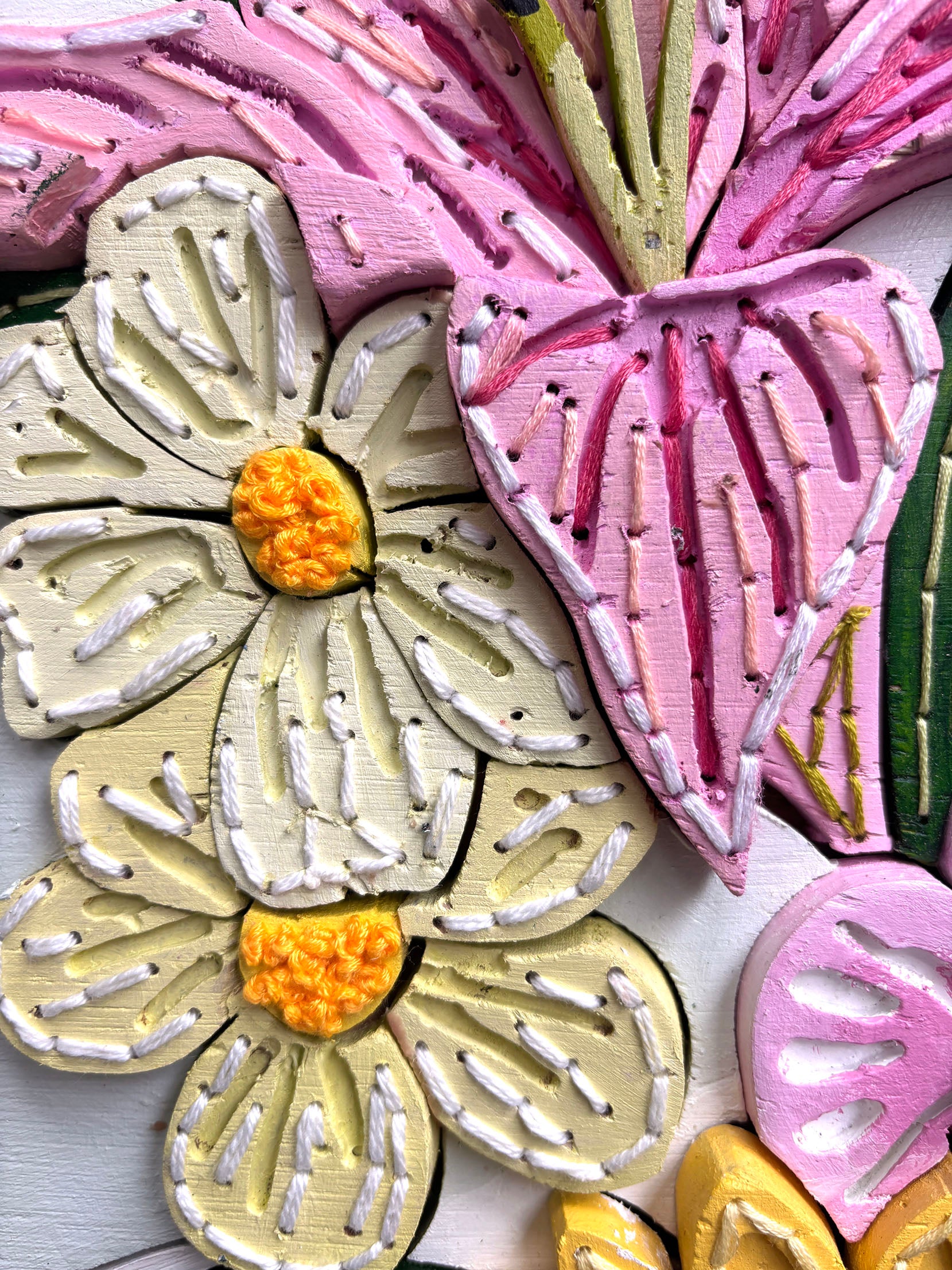Plywood, acrylic and embroidery on board, box framed in white timber.