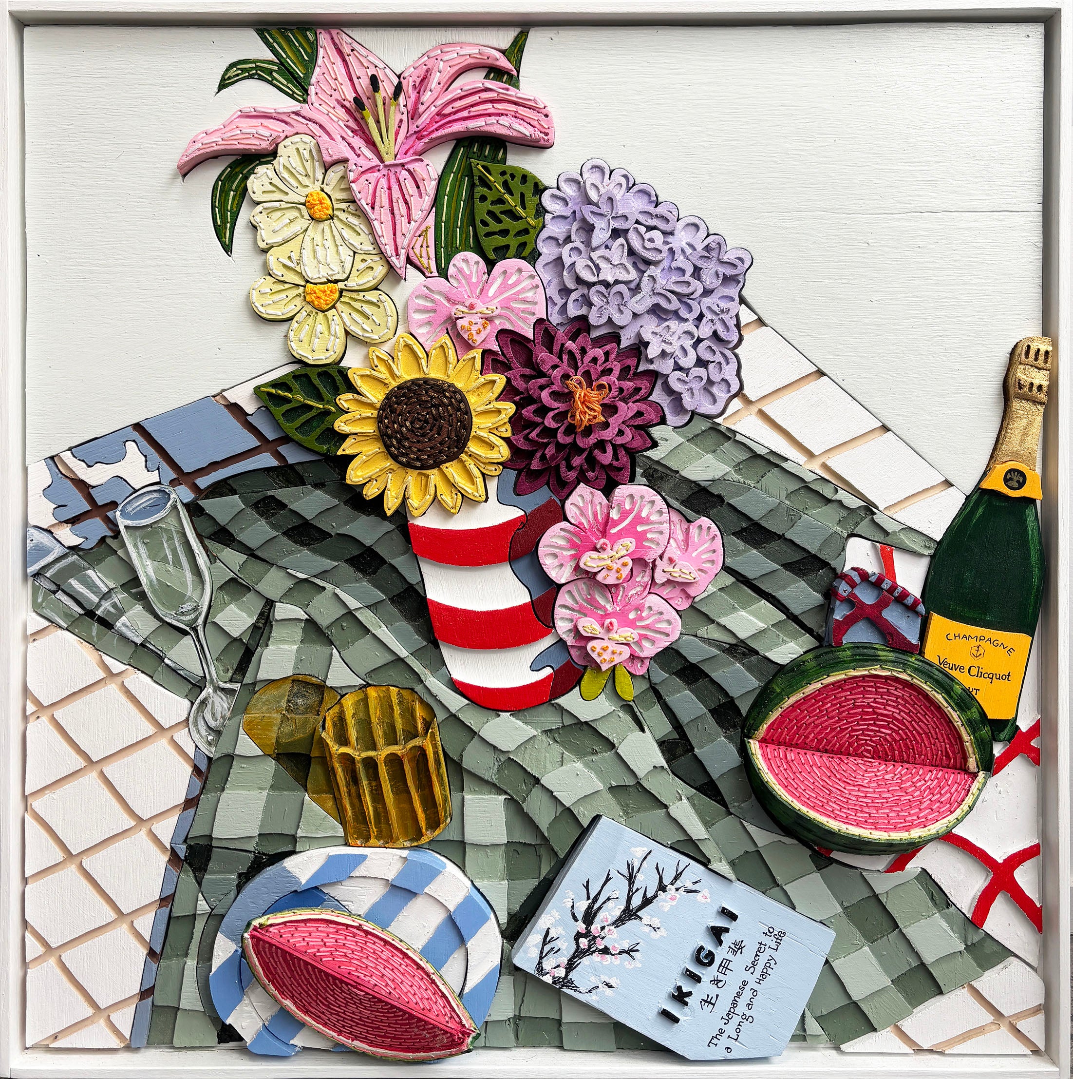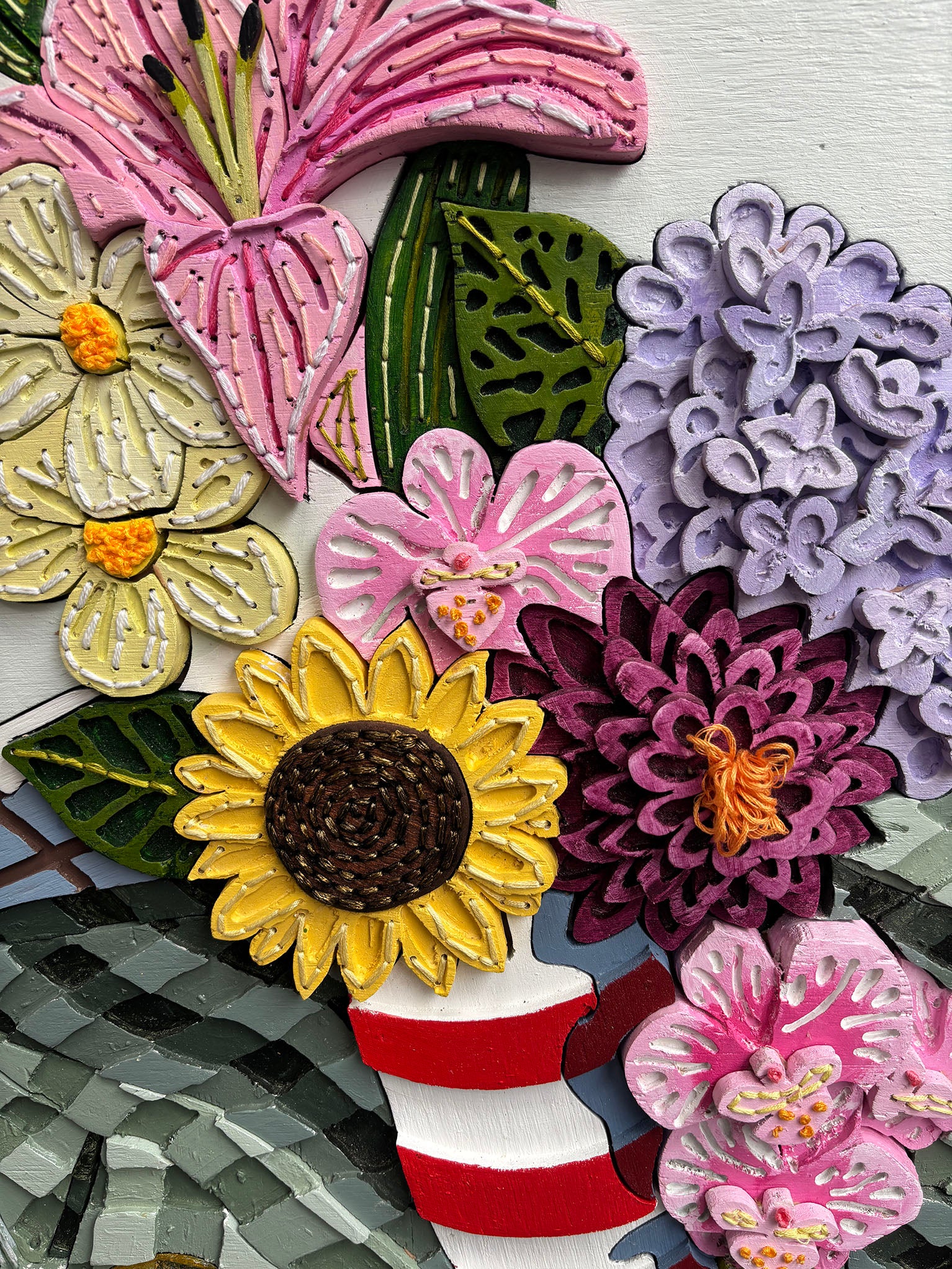 Misha Harrison is a sculpture and textile arts major, with a degree in Creative Arts. Her practice explores materiality and process through the still life genre, with each piece comprising of intricately hand cut, painted and embroidered plywood. Translating her images into three dimensional, sculptural artworks, Misha sees herself as crossing the traditionally masculine woodworking processes with the arts of embroidery and textiles that echo notions of femininity. Reminiscent of assembling a jigsaw puzzle, Misha’s artworks are layered pieces of wood, each cut, painted, and carefully finished to fit into its play. Dimension, form, texture and colour are each important components, transformed into elaborate assemblages. Piece by piece the artwork reveals itself, and for Misha the process of her art is as important as the finished result, an importance of hand made and hand-crafted pieces in the world of the ready-made and mass produced.