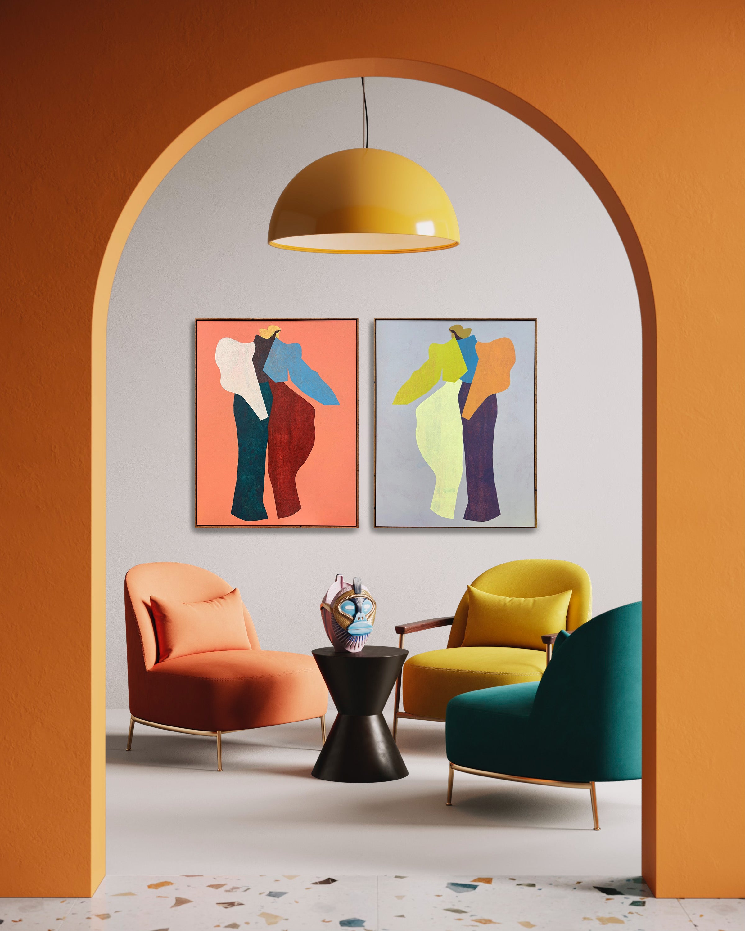 Her work now celebrates the richness of lived experience. Through bold forms, confident figures, layered textures and vibrant colour, she explores themes of connection, identity, joy, and the beauty found in everyday moments. Each piece is ultimately a reflection of love, diversity, togetherness and resilience.