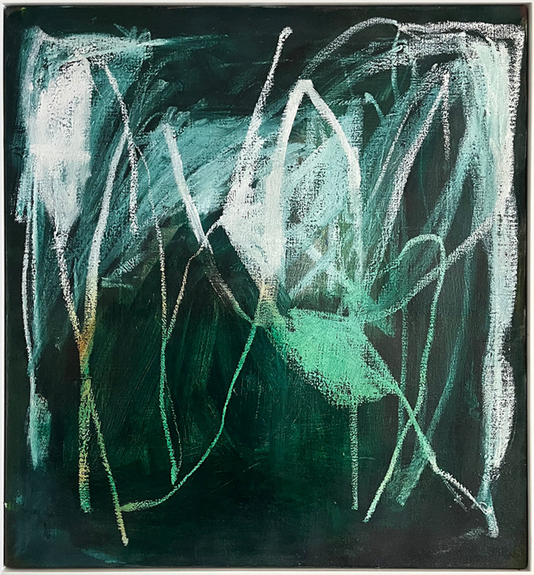 Oil, acrylic and ink on Belgian linen, box framed in white.