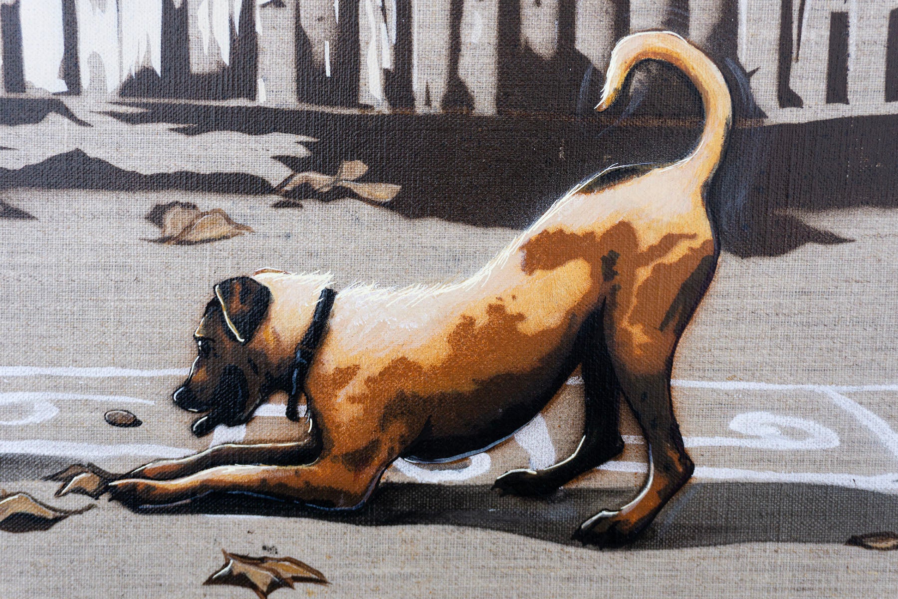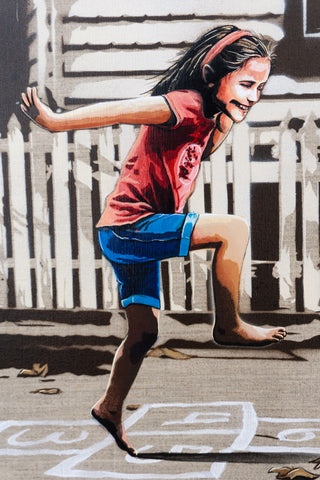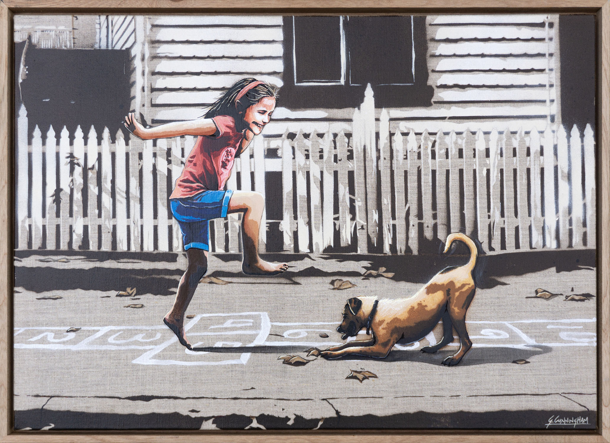 „Ein weiteres Stück aus meiner Serie „Spielende Kinder“. Ich stelle oft draußen spielende Kinder dar, vor allem, weil man das heutzutage seltener sieht. Die Kombination aus digitaler Dominanz und Helikopter-Elternschaft bedeutet leider, dass diese Art von Szenen für die Geschichtsbücher bestimmt sind.“ – Geoff