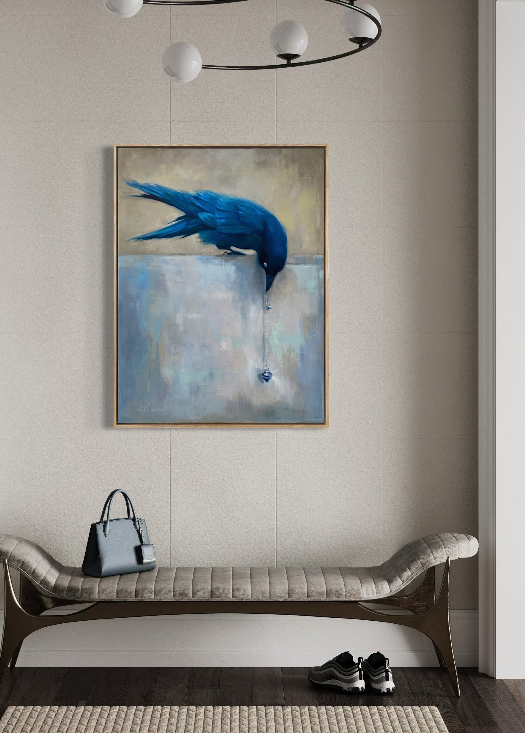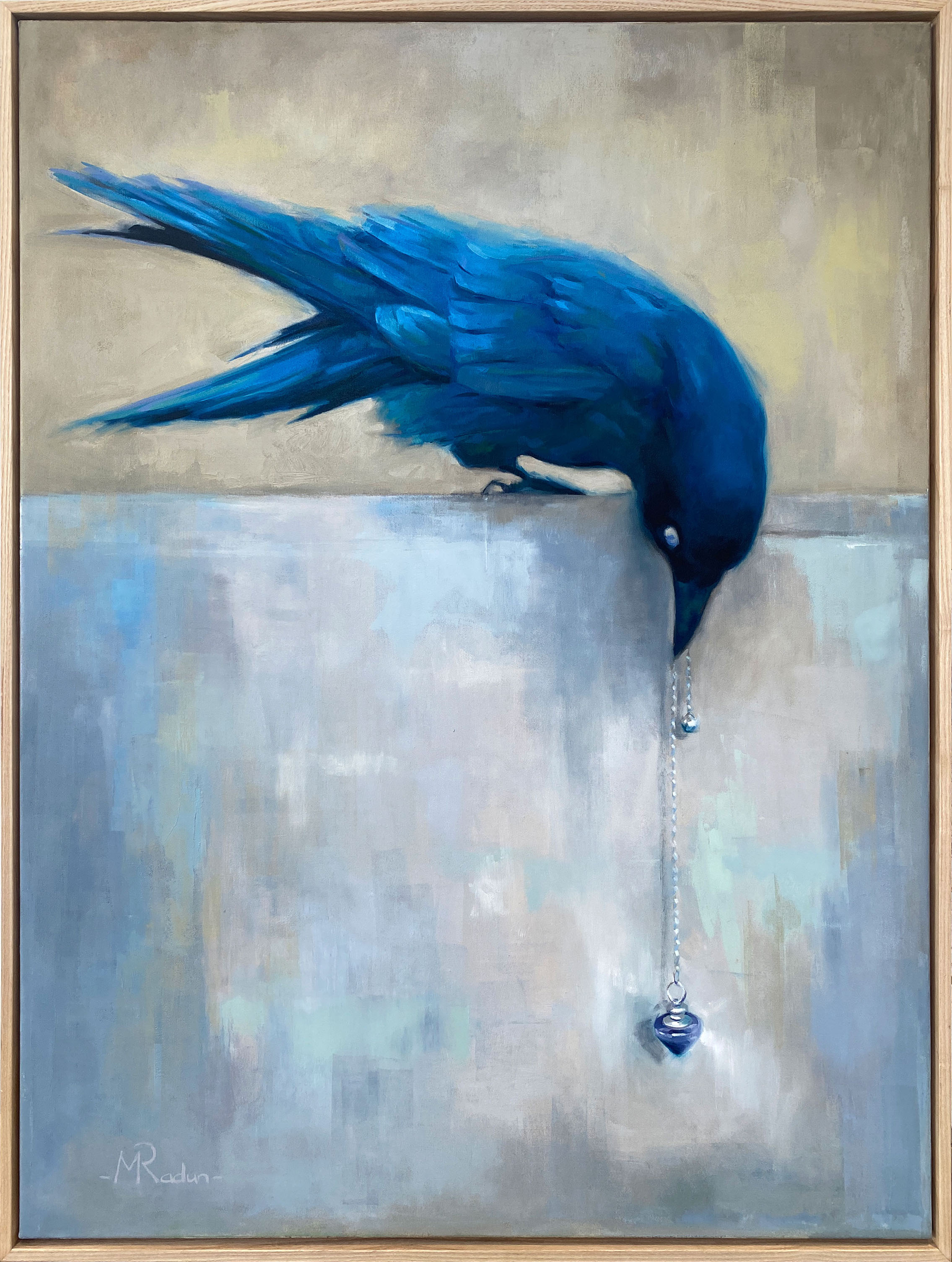 This oil painting shows a cheeky raven, a symbol of prophesy and insight, holding in its beak a d delicate pendulum made of amethyst. The stone is said to attract prosperity and abundance. The raven - a connector of the material and spiritual worlds, glows an iridescent blue absorbing the energies of the stone.