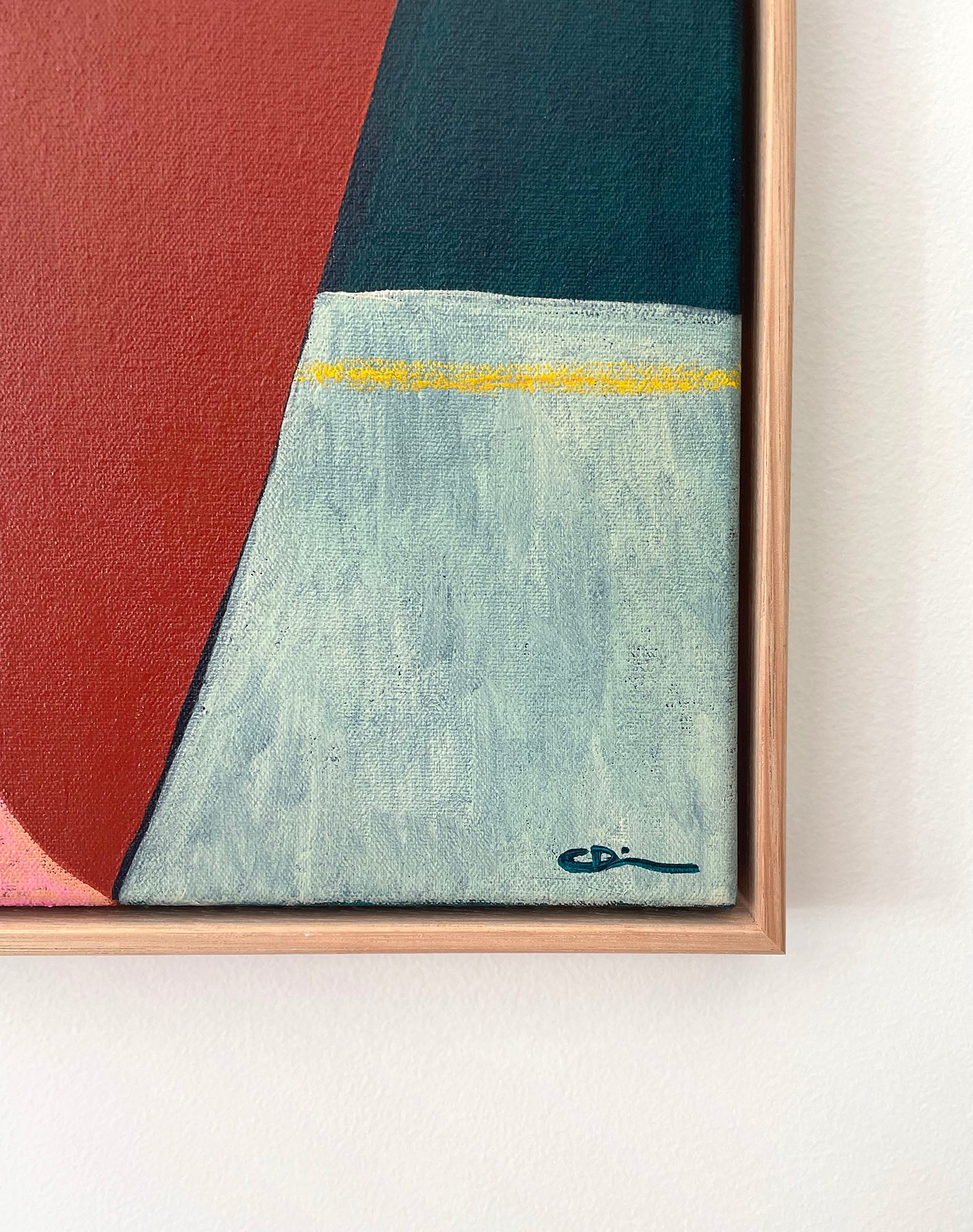 Acrylic and oil pastel on canvas, box framed in raw oak.