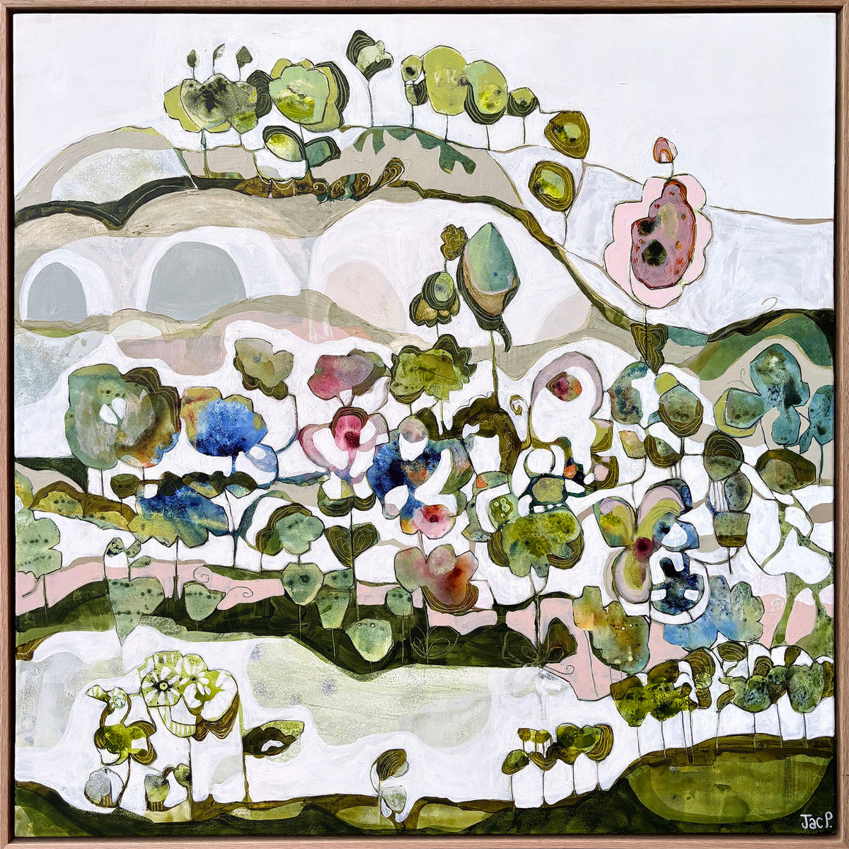 Acrylic on linen, framed in raw oak.