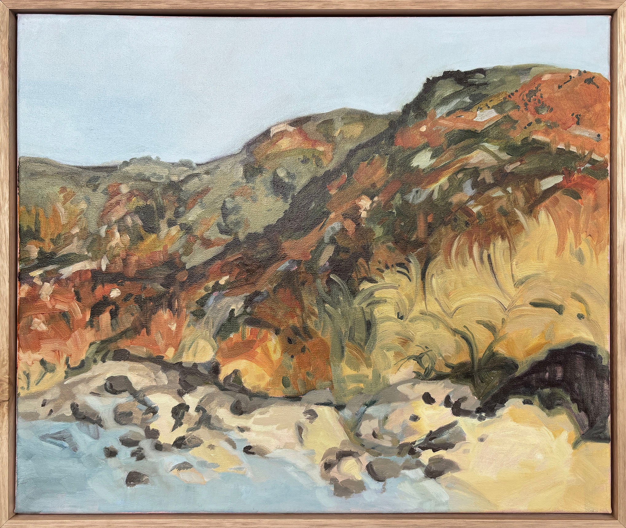 Oil on canvas, box framed in raw timber.