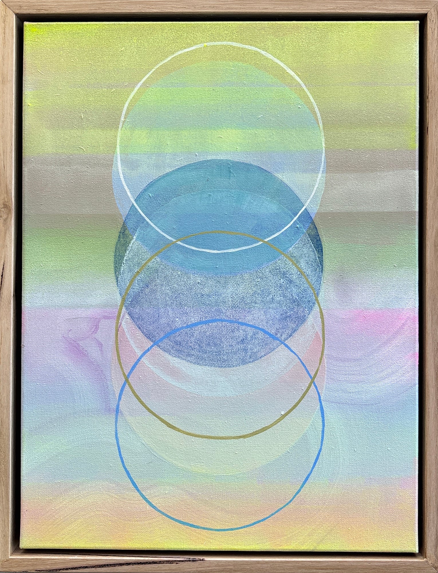 The ‘Many Moons Nights’ series uses lunar shapes, repetition and colour gradients in evoking the passage of time. Connecting with natural rhythms such as paying attention to the moon cycle has become part of my daily activities and influenced this calendar-like grid collection. Each piece acts as a little meditation of sorts, with central shapes woven into grounds with horizon lines. The colour scheme draws from luminous skies at dawn and nightfall. Perhaps these paintings may act as a touchstone to honour time in an often speedy world.
