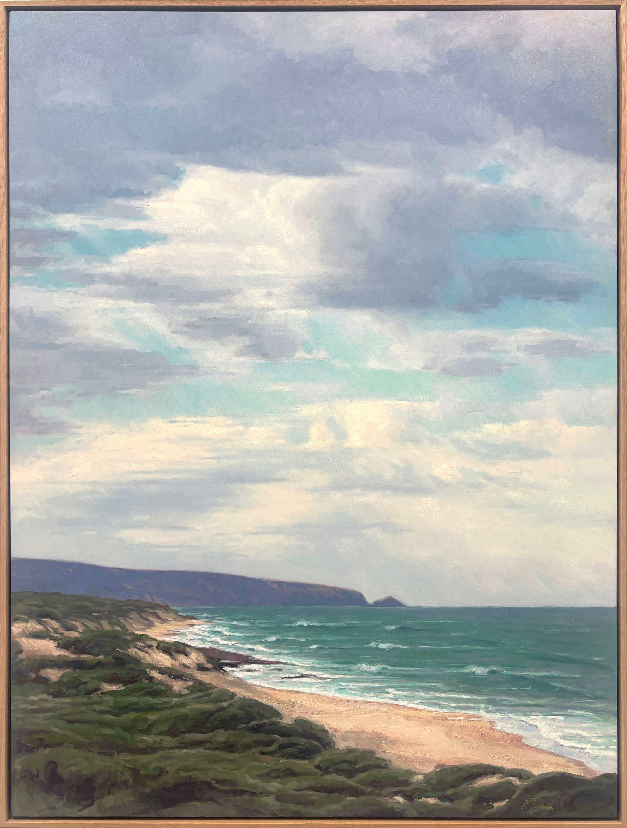 Untethered captures the immensity of the southern sky as clouds drift with the wind toward the open ocean. When I come to explore the coast, I experience a sense of release. The fresh air in my lungs and the openness of the space bring me clarity and quiet. This painting is an attempt to hold onto that feeling, to distil a fleeting moment of freedom and preserve it in paint.