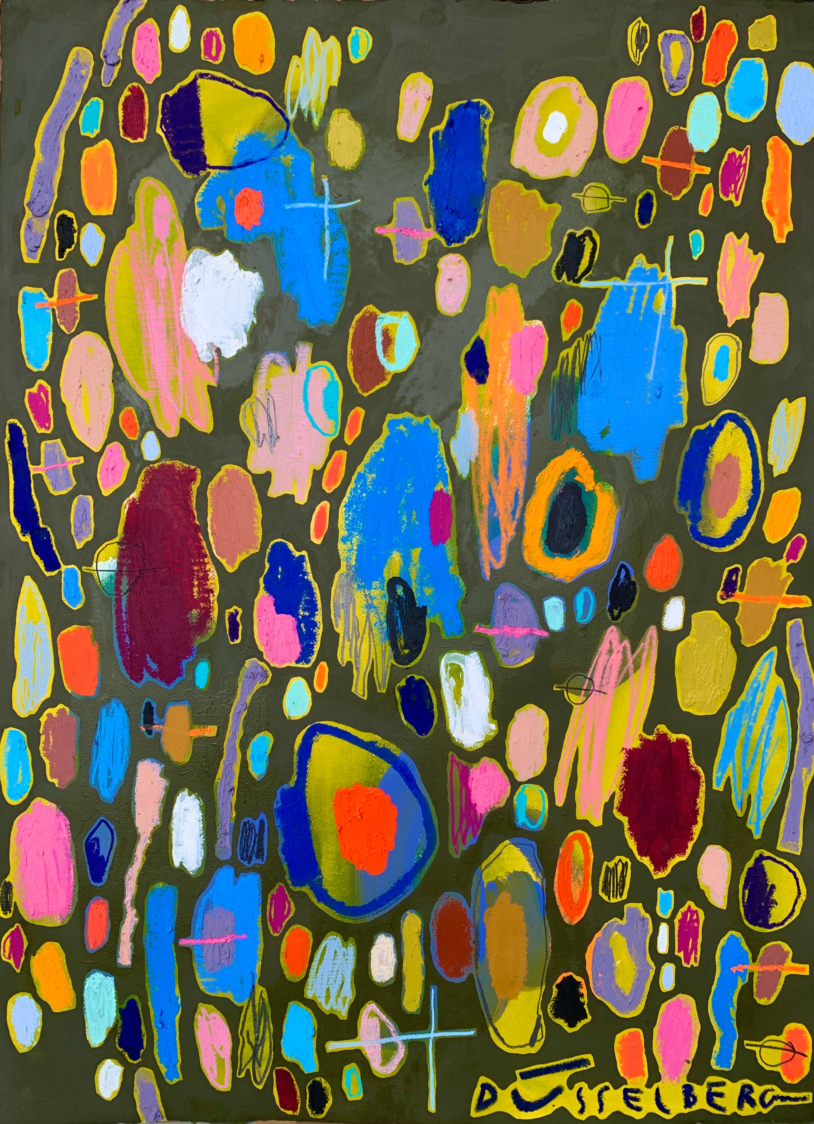 Acrylic, oil pastel, wax crayon, pencil, oil stick, oil paint on watercolour paper.